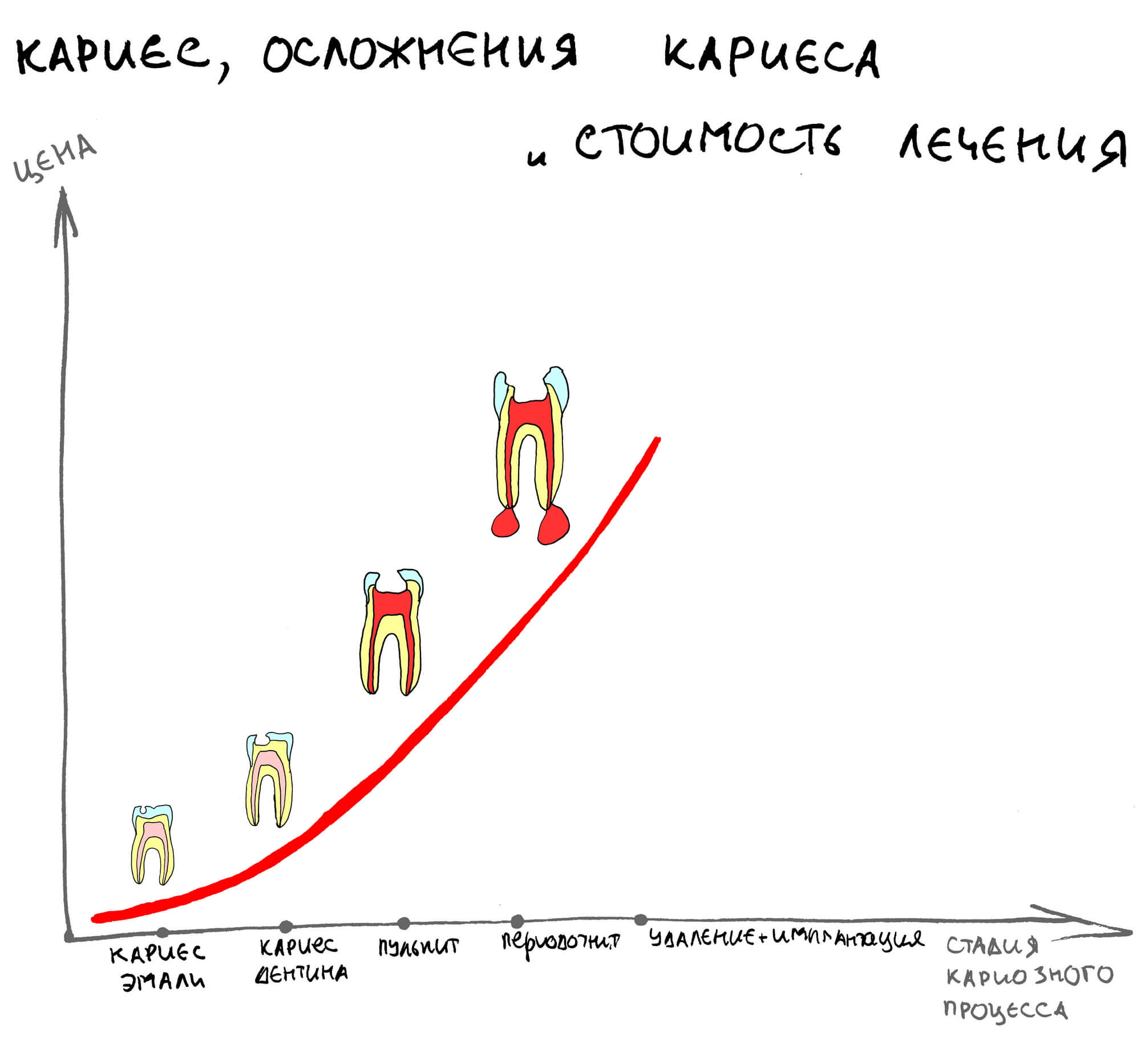 Если мы сопоставим стоимость лечения и стадии кариозного процесса в виде графика, то получим интересную зависимость