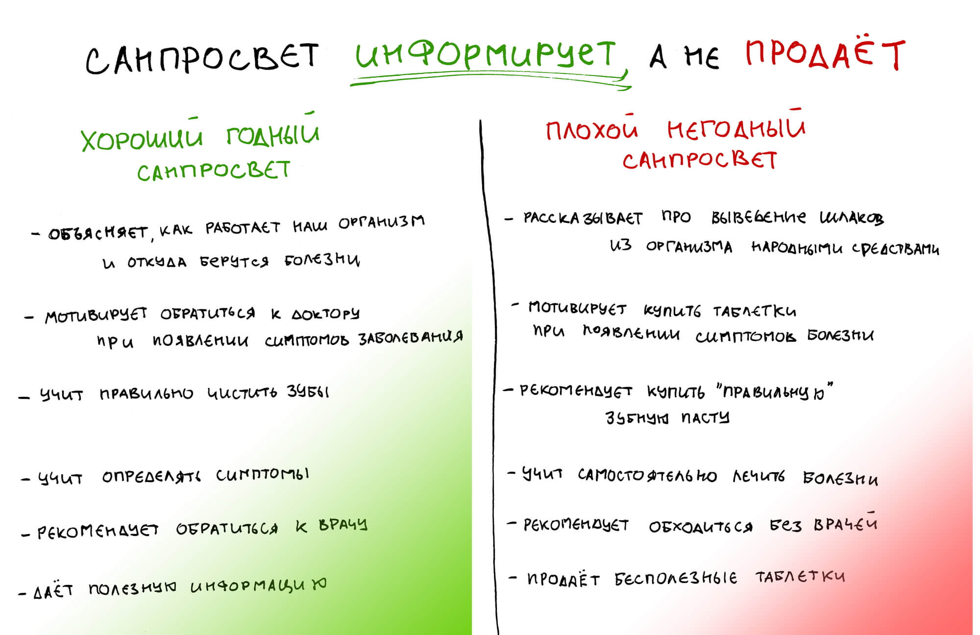 А ведь, по сути, правильная санпросветработа не должна лечить. Она не должна вам ничего навязывать или продавать. У санпросвета одна цель — мотивировать вас внимательнее относиться к своему здоровью, регулярно посещать доктора, проходить обследование и т. д.
