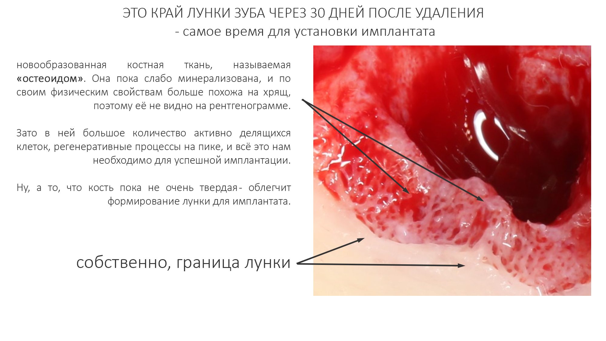 С одной стороны, добиться первичной стабильности имплантата в таких условиях непросто. Но, если мы не планируем немедленную нагрузку — нафиг нам нужна первичная стабильность? С другой стороны, в этом самом остеоиде преобладают активно делящиеся клетки, остеобласты и фибробласты, идёт активный рост сосудов и нервов, все регенеративные процессы находятся на пике — разве это не самое удачное время для установки имплантата? Ведь всё, что нам нужно — это деление клеток. Именно за счёт него происходит восстановление кости, врастание биоматериалов, интеграция имплантатов и т. д.
