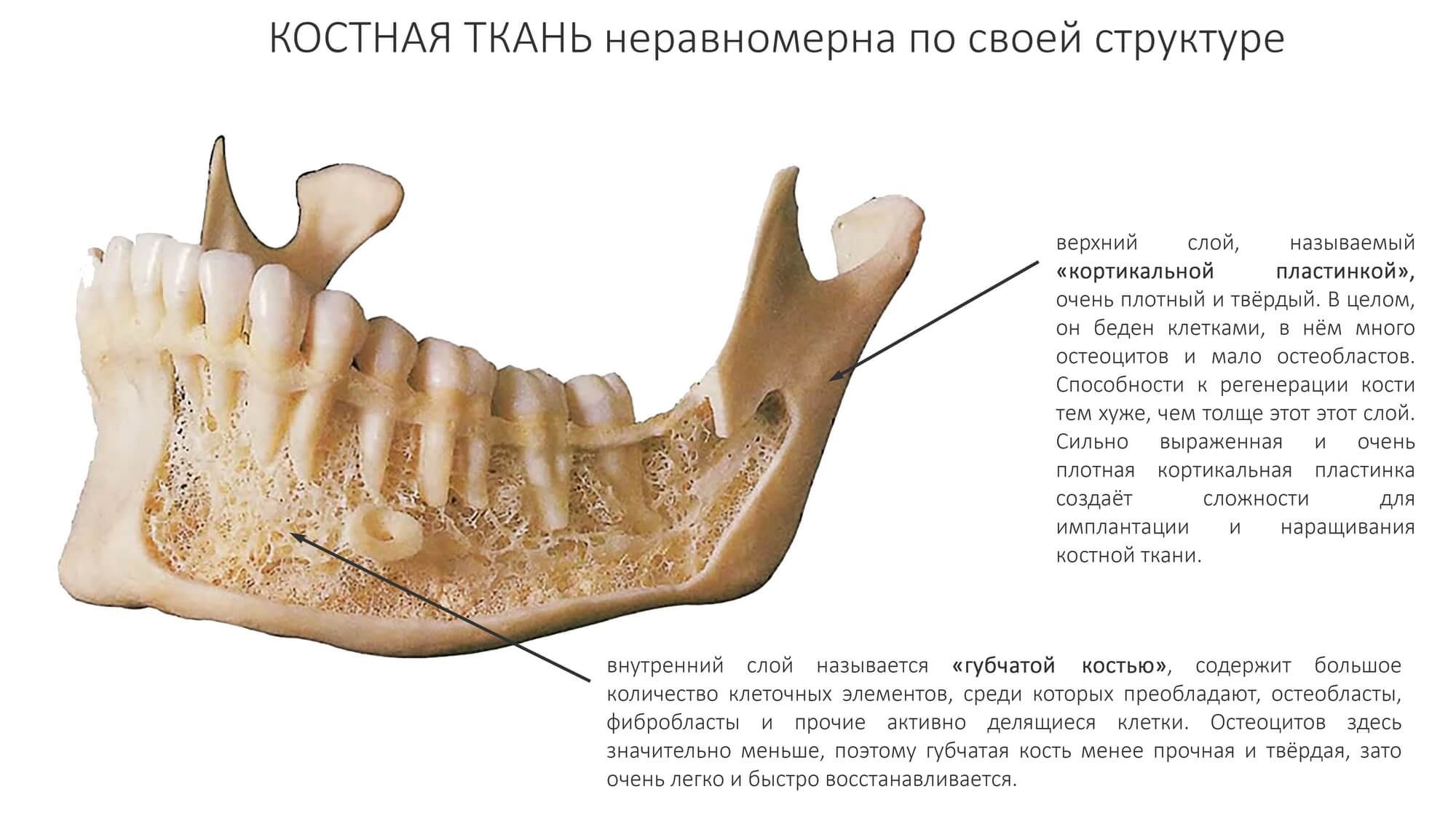 И, конечно, её клеточный состав неравномерен — в кортикальном слое больше остеоцитов (от этого он хуже регенерирует), а в подлежащем губчатом слое больше остеобластов (поэтому «рыхлая» костная ткань, практически, не подвержена атрофии и регенерирует значительно лучше). Кроме того, в разное время и разном возрасте, соотношение клеток тоже может быть разным.