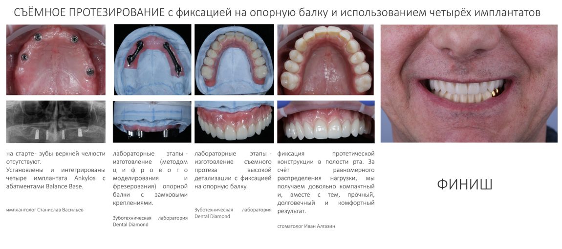 Поэтому с большим количеством имплантатов (минимально — 4 единицы) можно создать съёмный протез с фиксацией на балке.