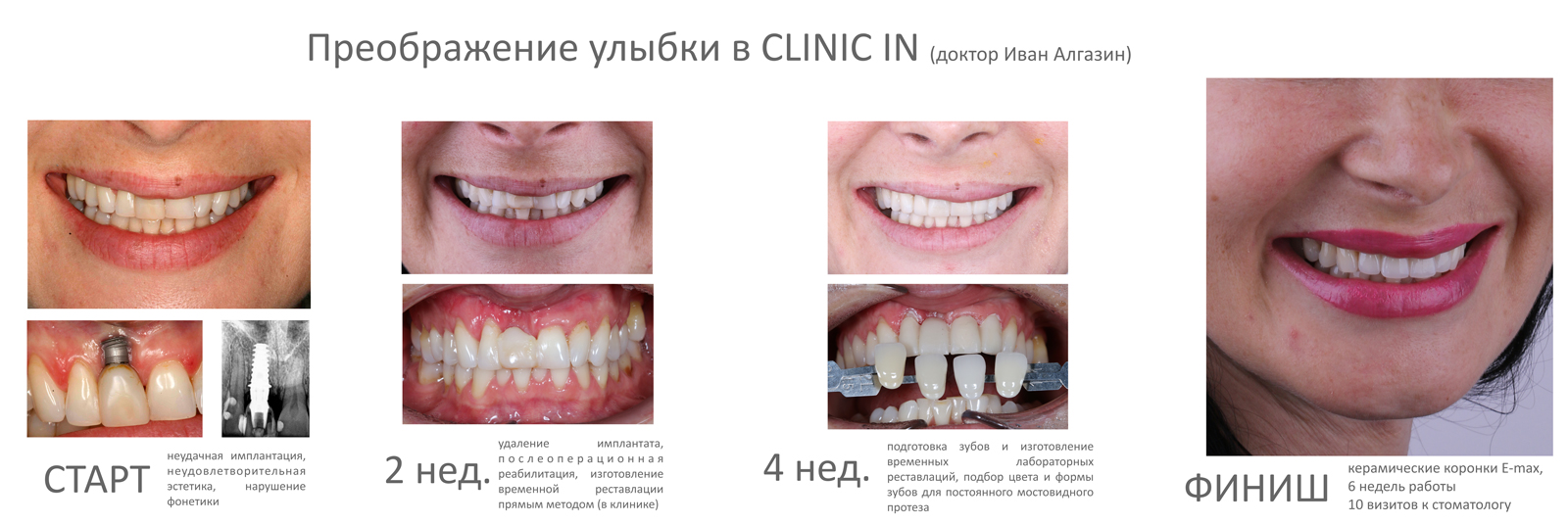 • стоматологи CLINIC IN могут провести реабилитацию любой сложности. Но для того, чтобы выполнить ваши пожелания, нам необходимо, как минимум, их знать. Поэтому приготовьтесь к большому количеству вопросов, на которые нужно будет дать конкретные и внятные ответы.