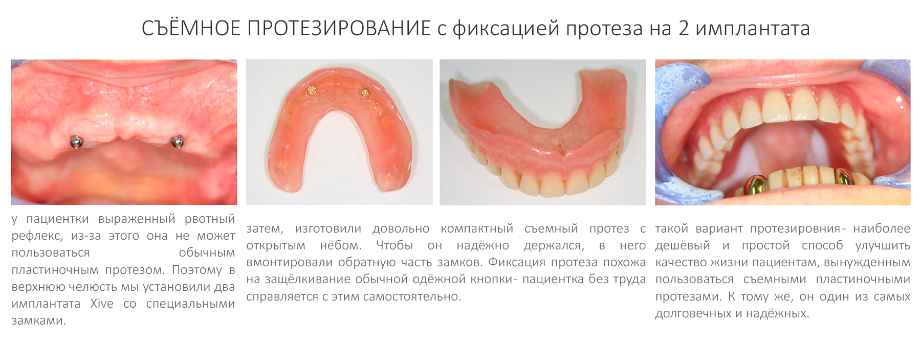 Съемное протезирование также может быть реализовано с использованием дентальных имплантатов.