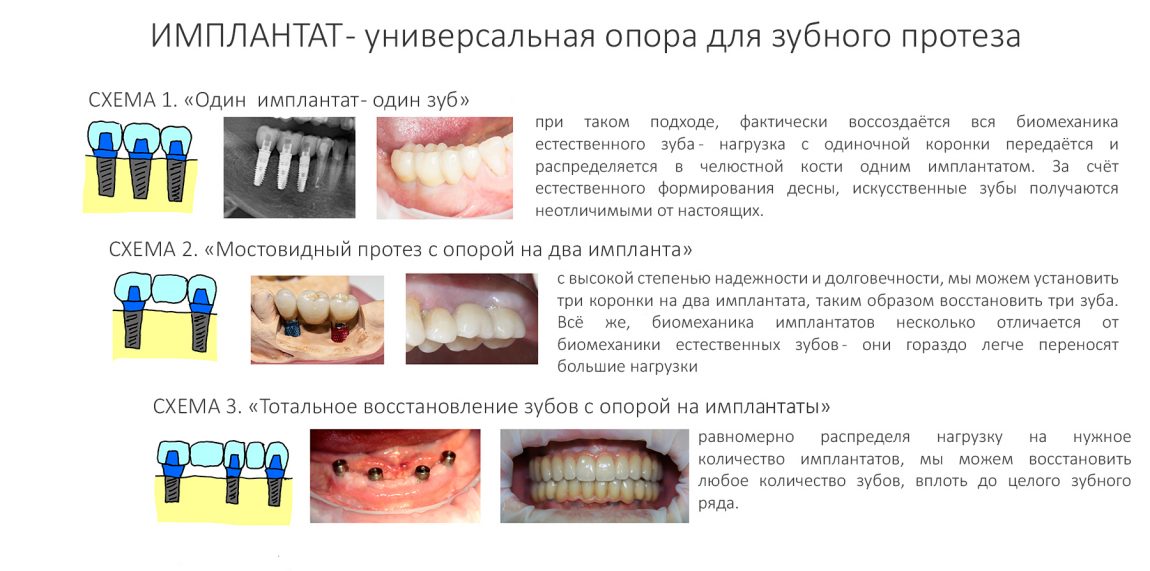 Суть использования имплантатов для несъемного протезирования предельно проста — также, как и зубы, они создают неподвижную, надёжную и, самое главное, универсальную опору для зубного протеза. Таким образом, использование имплантатов позволяет реализовывать самый широкий диапазон вариантов стоматологического протезирования: