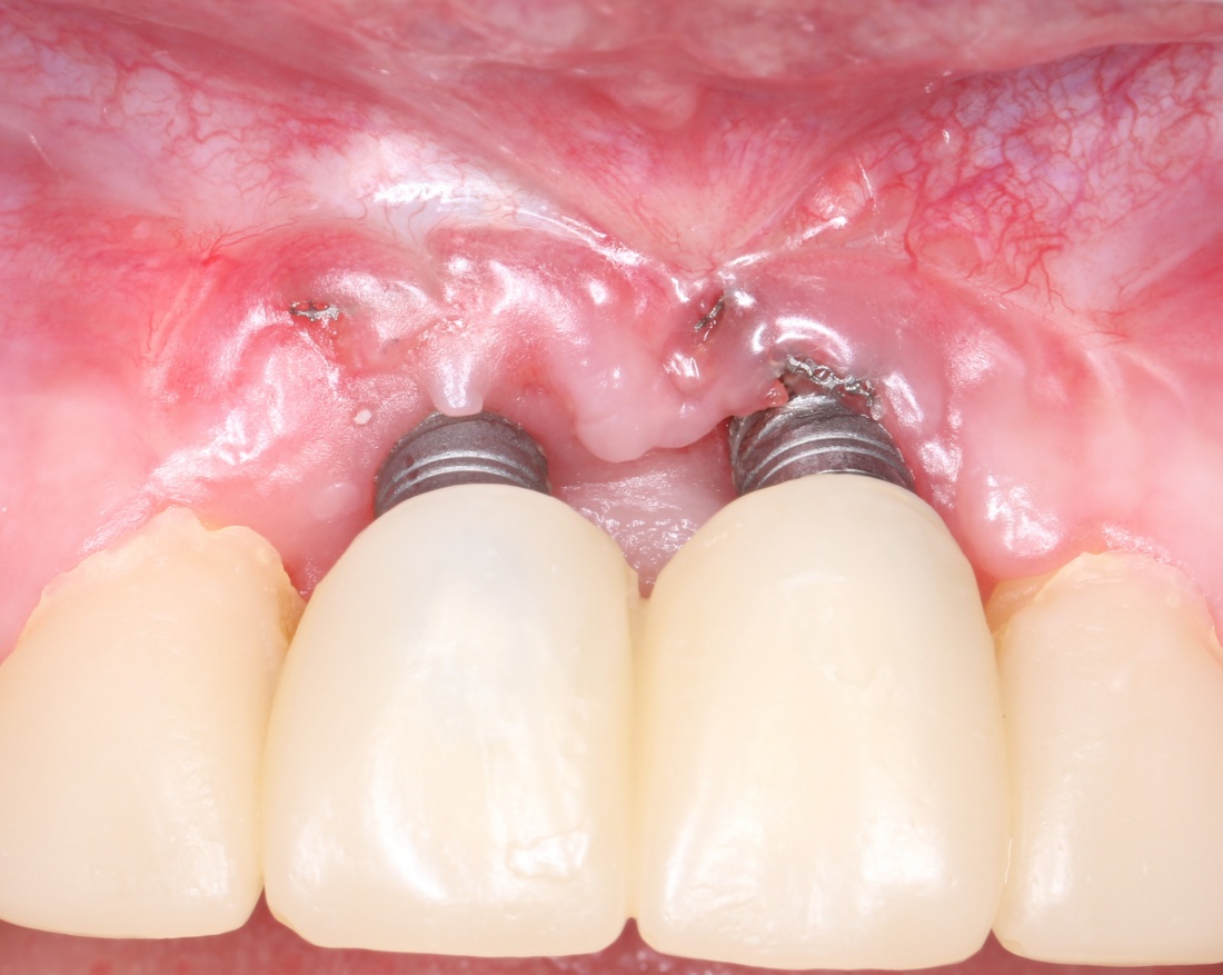 Теперь нам нужно утолщить десну. ССТ, как говорится, в помощь. Имплантаты зашиваются наглухо лоскут оказывается прямо под соединёнными краями раны.