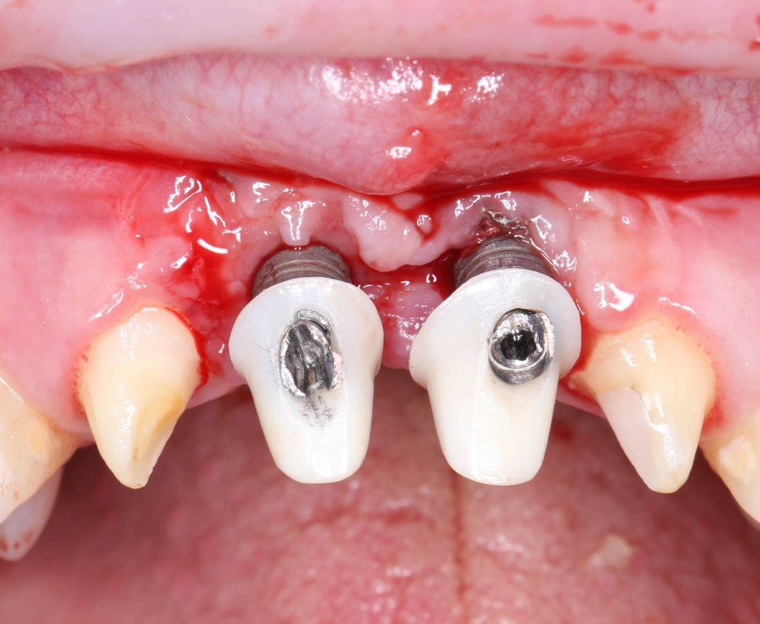 Итак, в данном случае, причин несколько. Во-первых, и это очевидно — чрезмерные усилия при установке имплантатов. Поскольку «воронки» вокруг них образовались еще до протезирования. Во-вторых, тонкий и недостаточный объём кератинизированной десны — как результат, прорезывание заглушек и инфицирование поверхности имплантата.