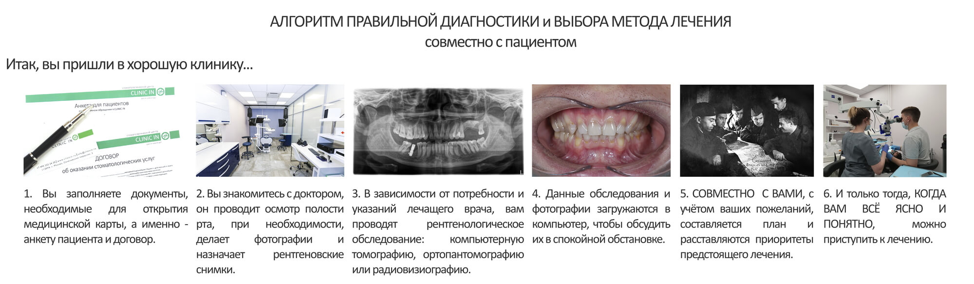 В нормальных клиниках, где дорожат своей репутацией и уважают своих пациентов, она проходит следующим образом: доктор внимательно выслушивает пациента, затем, по показаниям, делает рентгеновские снимки и серию дентальных фотографий, всё это загружается в компьютер, после чего он объясняет пациенту то, что нужно лечить и СОВМЕСТНО С НИМ определяет порядок и приоритеты предстоящего лечения.