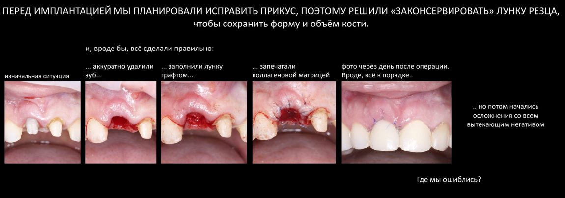 Однако, через некоторое время у пациентки начались проблемы: воспалилась десна, появились боли. Она пришла на осмотр, а я, не удосужившись снять консоль и внимательно всё осмотреть, сказал ей, что «такое бывает, не переживайте, скоро пройдёт». В течение недели ситуация не улучшилась, из лунки начал вываливаться графт. В течение месяца мы потеряли весь результат проведённой операции и даже больше, поскольку из-за спровоцированного графтом хронического воспаления, ушла часть костного объёма.