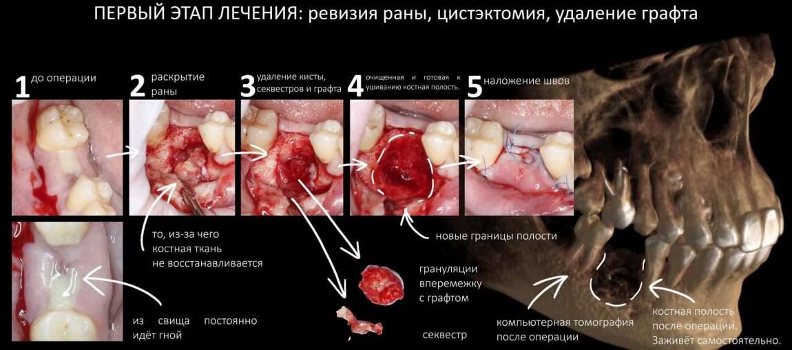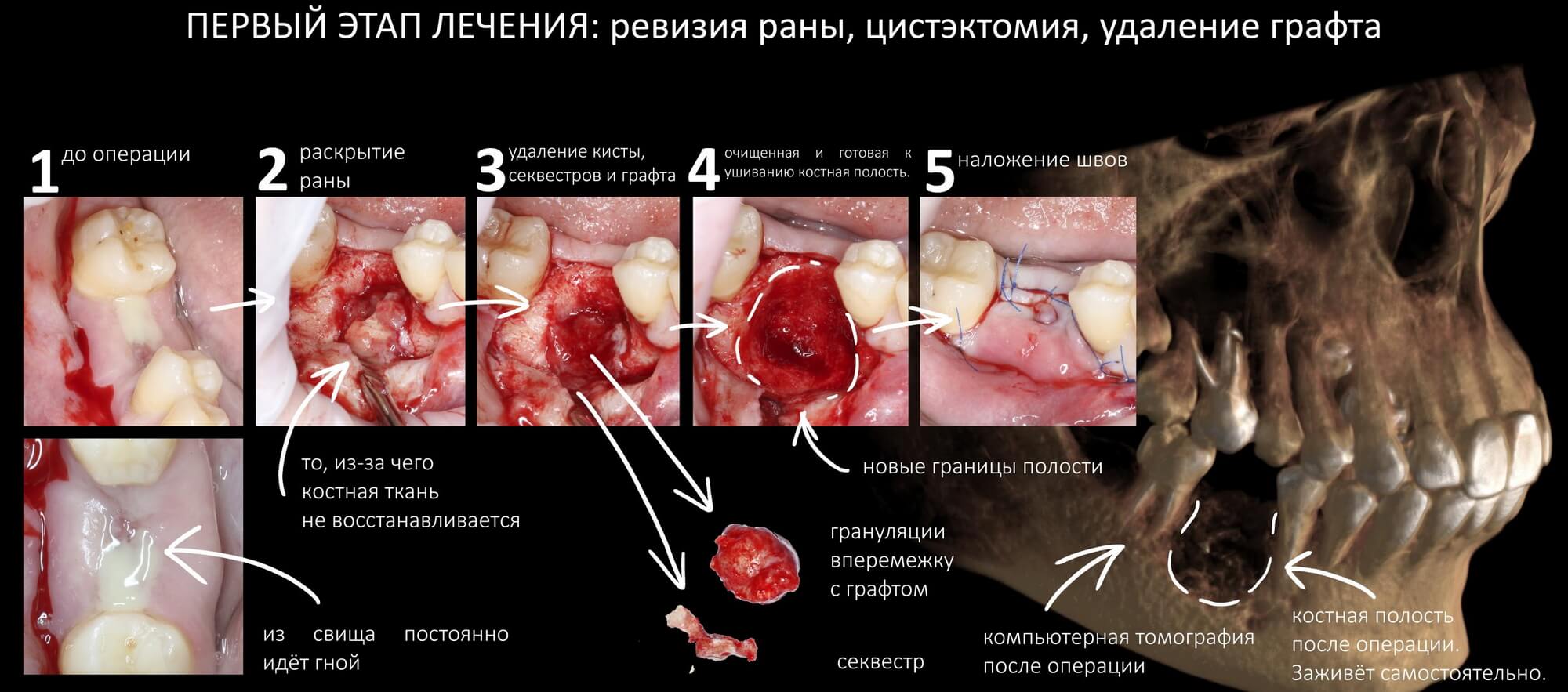 Причина всех проблем в этом случае — та самая искусственная кость в полости кисты (которая никак не интегрировалась) и вызванное ей хроническое воспаление. Пока она там есть — невозможно получить хороший результат.
