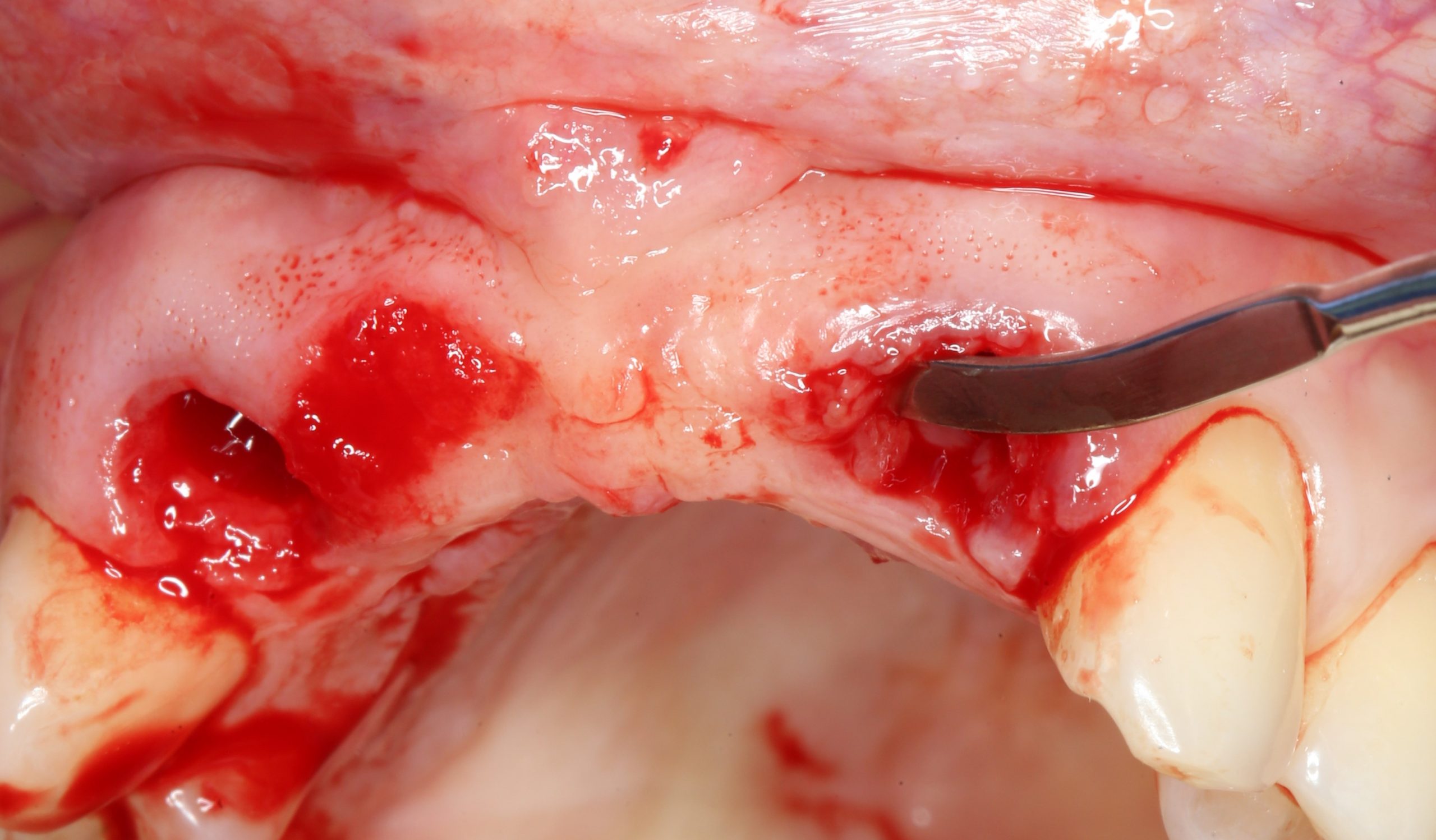 Следующий шаг — подготовка ложа под соединительнотканный аутотрансплантат или, проще говоря — под пересадку десны. Мы решили минимизировать травму, поэтому будем создавать подслизистый тоннель: