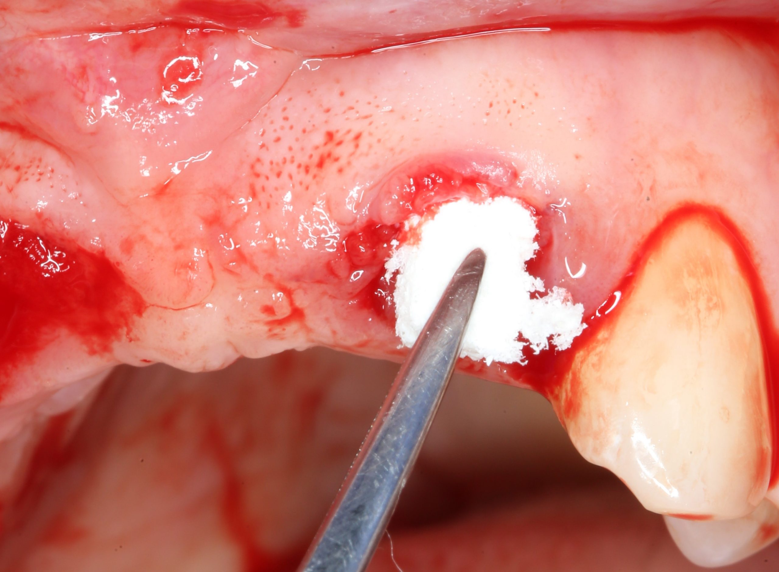 Для этого мы используем специфический ксенографт Bio-Oss Collagen, выпускаемый компанией Geistlich. Другое название, «впихнуть невпихуемое», является лучшей его характеристикой — с ним удобно работать в узких пространствах, где использование порошкообразных и гранулированных графтов затруднено.