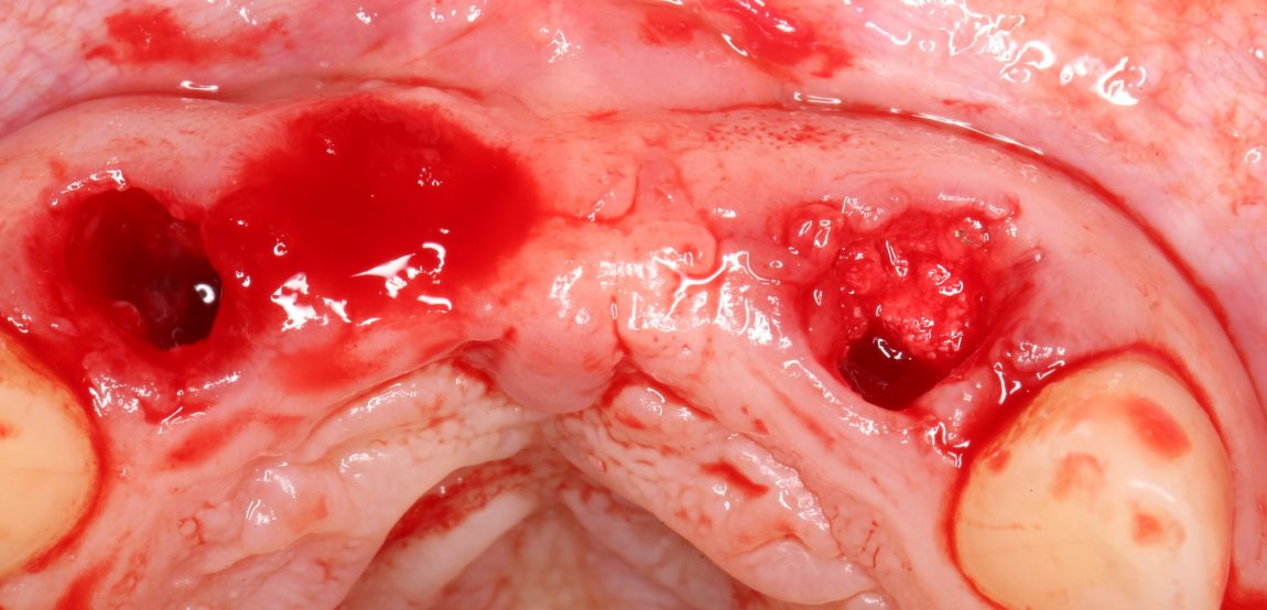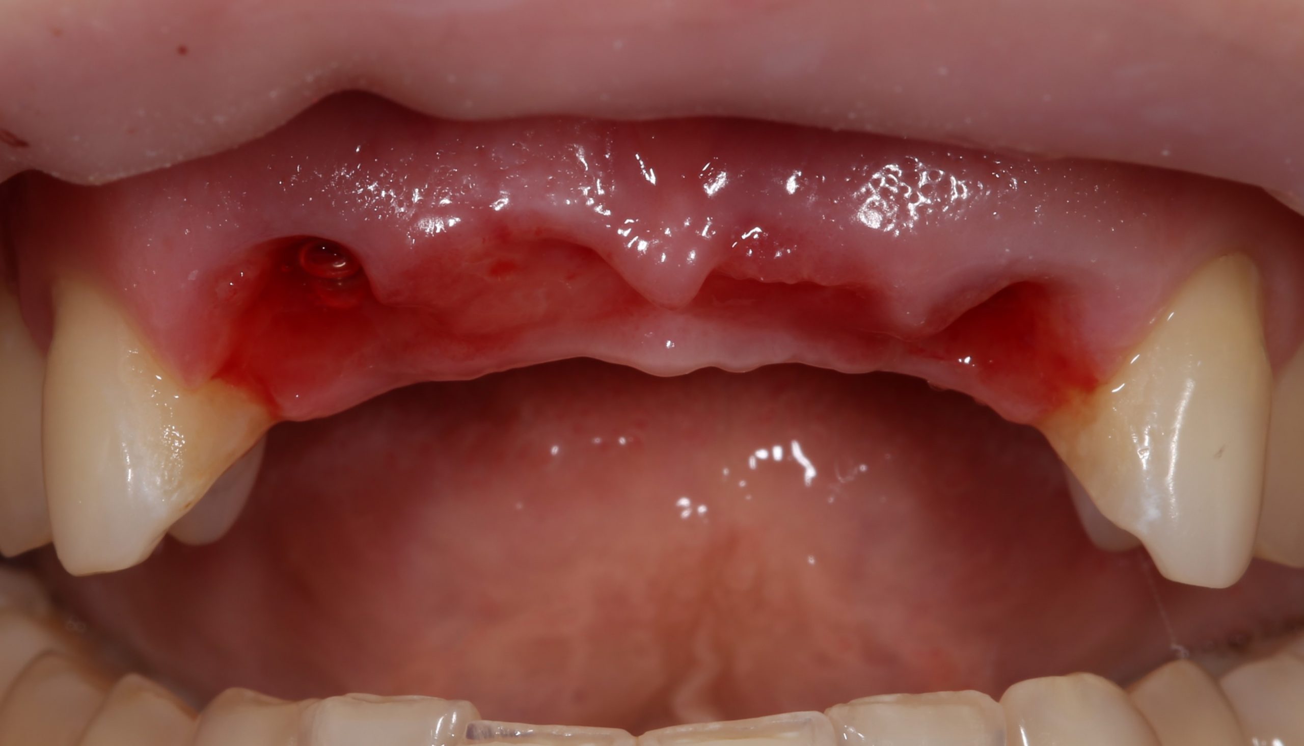 2. удаление, установка имплантатов в области 12, 22 зубов, пластика десны в области резцов верхней челюсти, возможно — аугментация лунок 12, 22 зубов с помощью ксенографта.