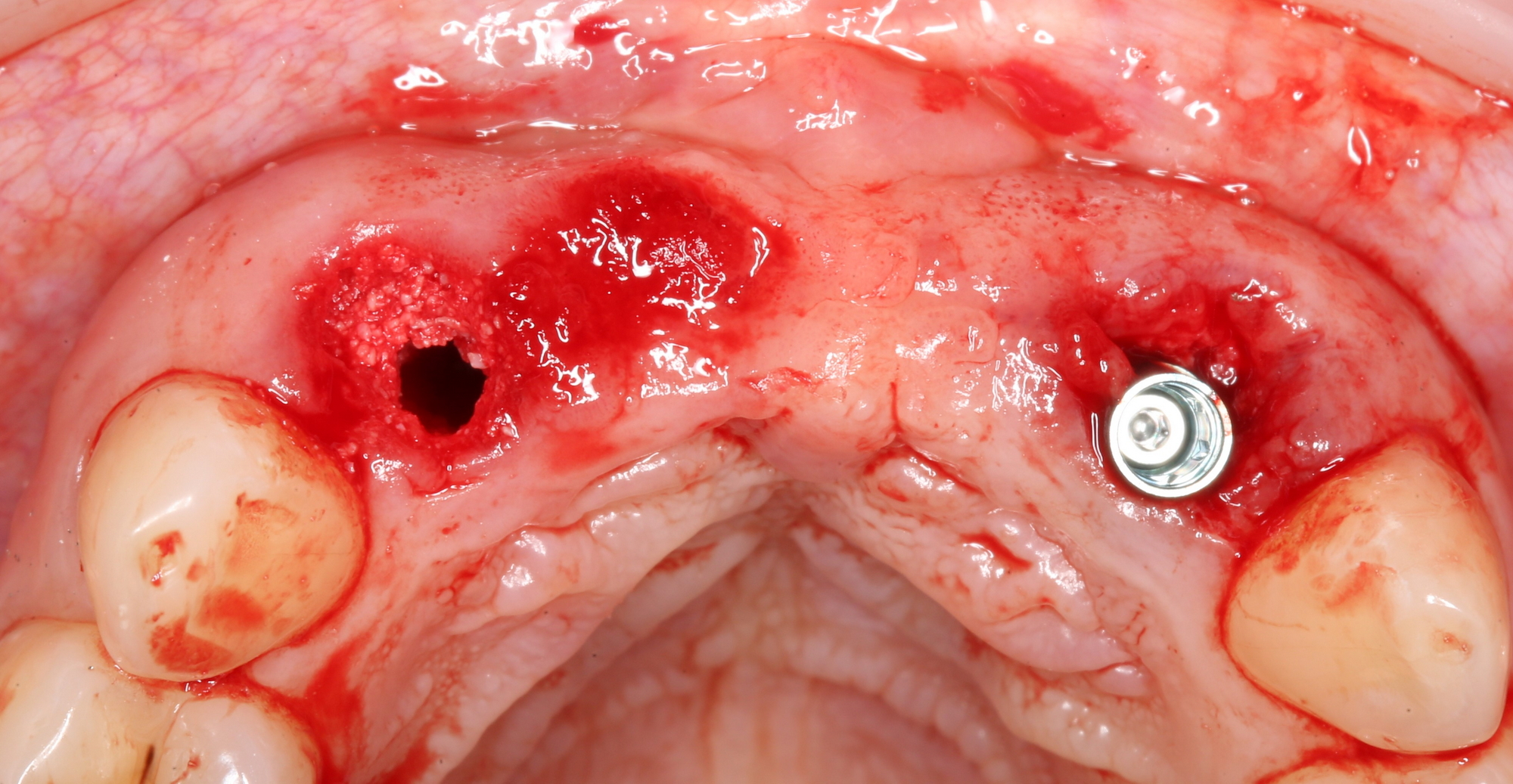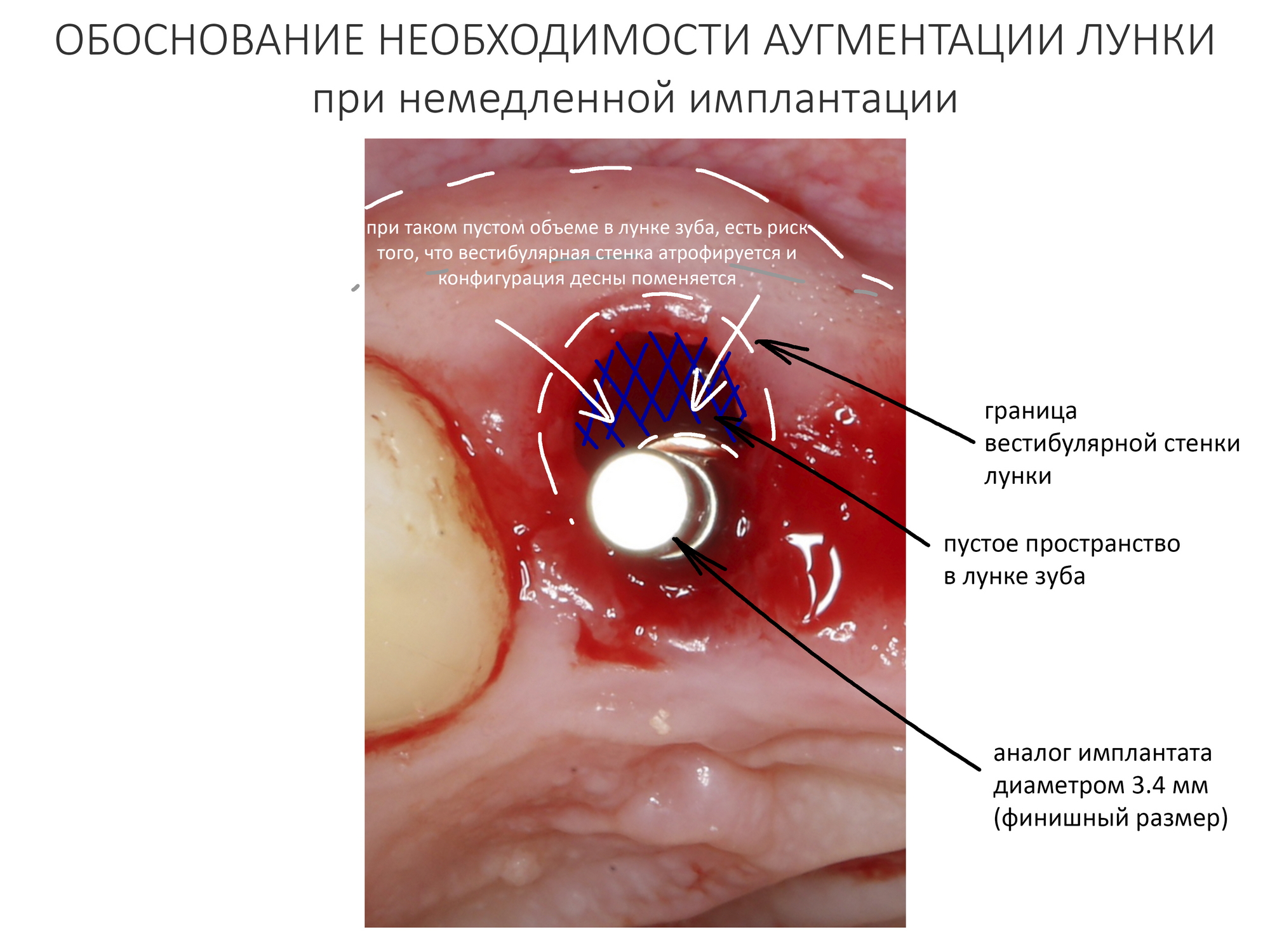 В процессе подготовки лунки под имплантаты, мы обратили внимание на следующий момент: между финишным диаметром аналога имплантата (3.4 мм) и вестибулярной стенкой лунки удалённого резца остаётся пустое пространство. Маловероятно, что костная стенка такой толщины уйдёт в небытие, но у нас есть пример атрофии в области центральных резцов — там кость ушла. Поэтому мы приняли решение об аугментации лунок: