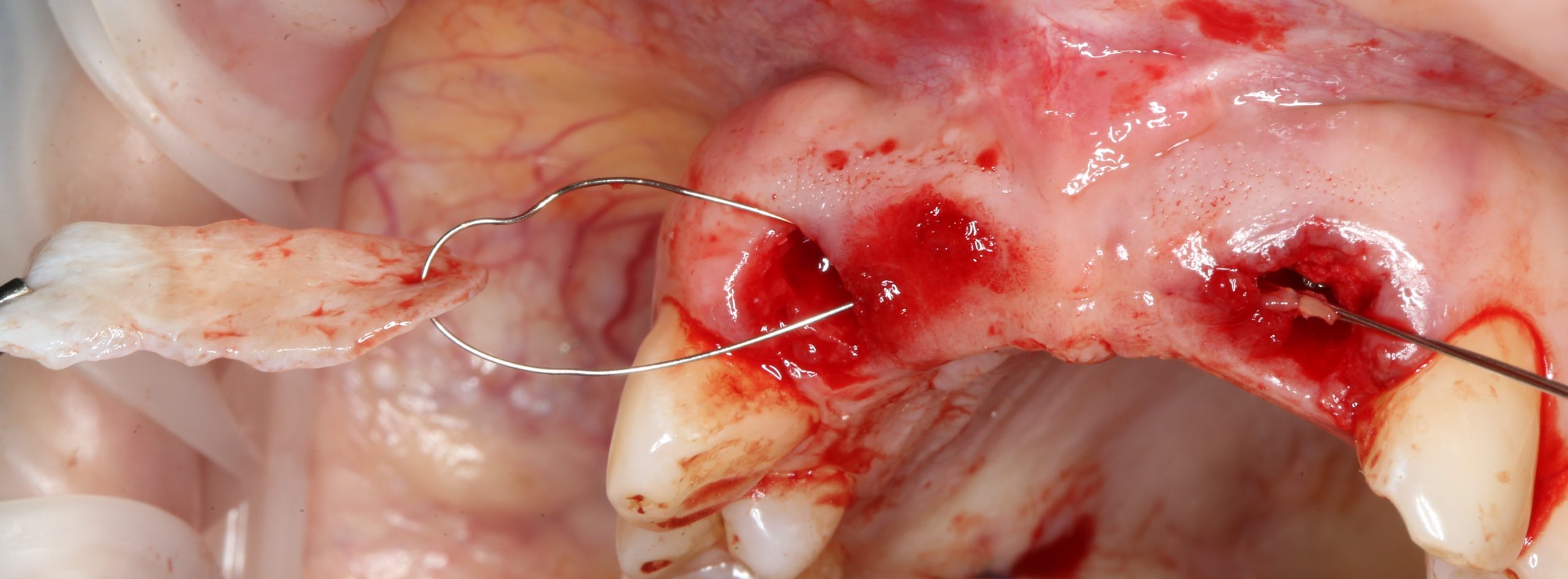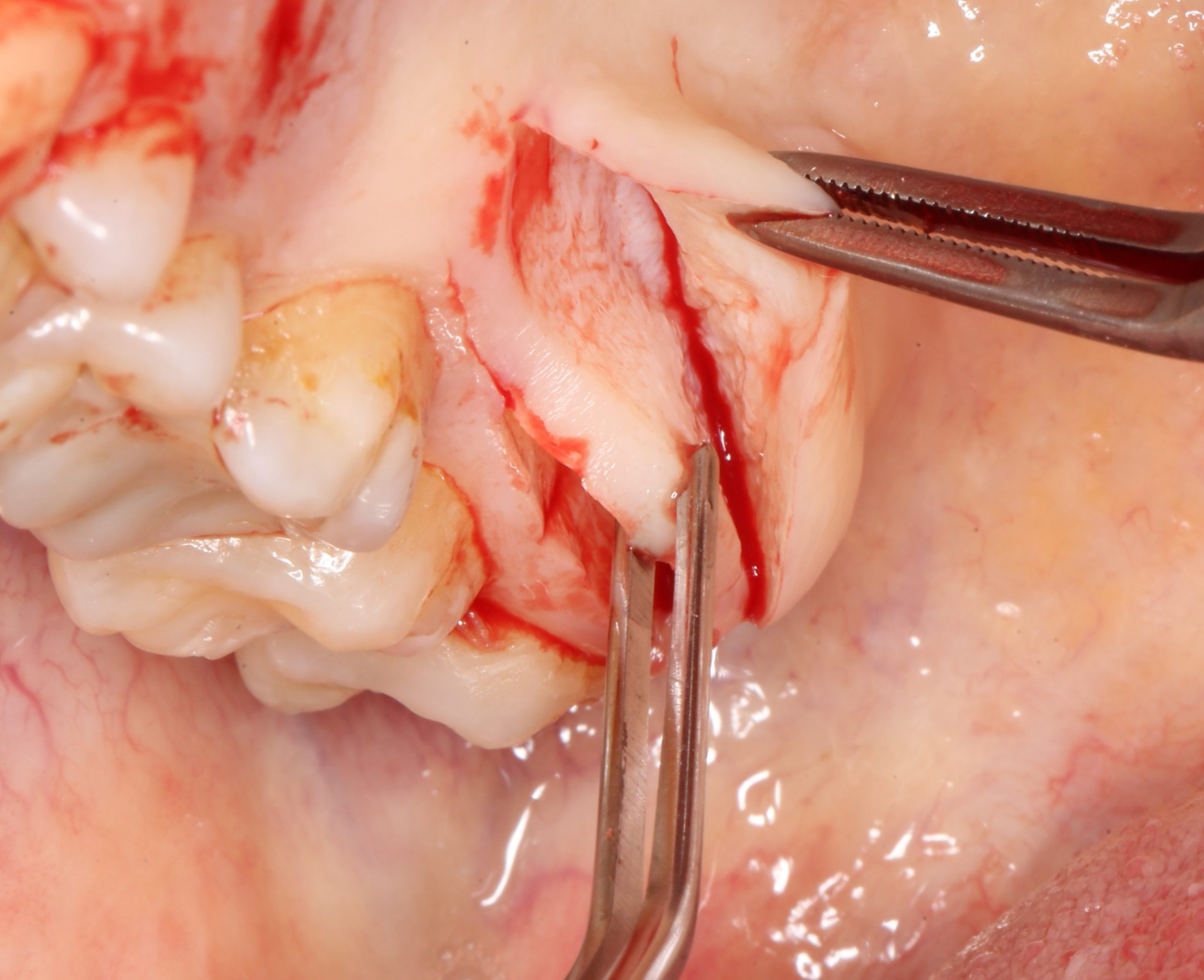 В качестве донорского участка мы выбираем отдел твёрдого нёба ближе к бугру верхней челюсти. Забор аутотрансплантата осуществляется методом расщепления:
