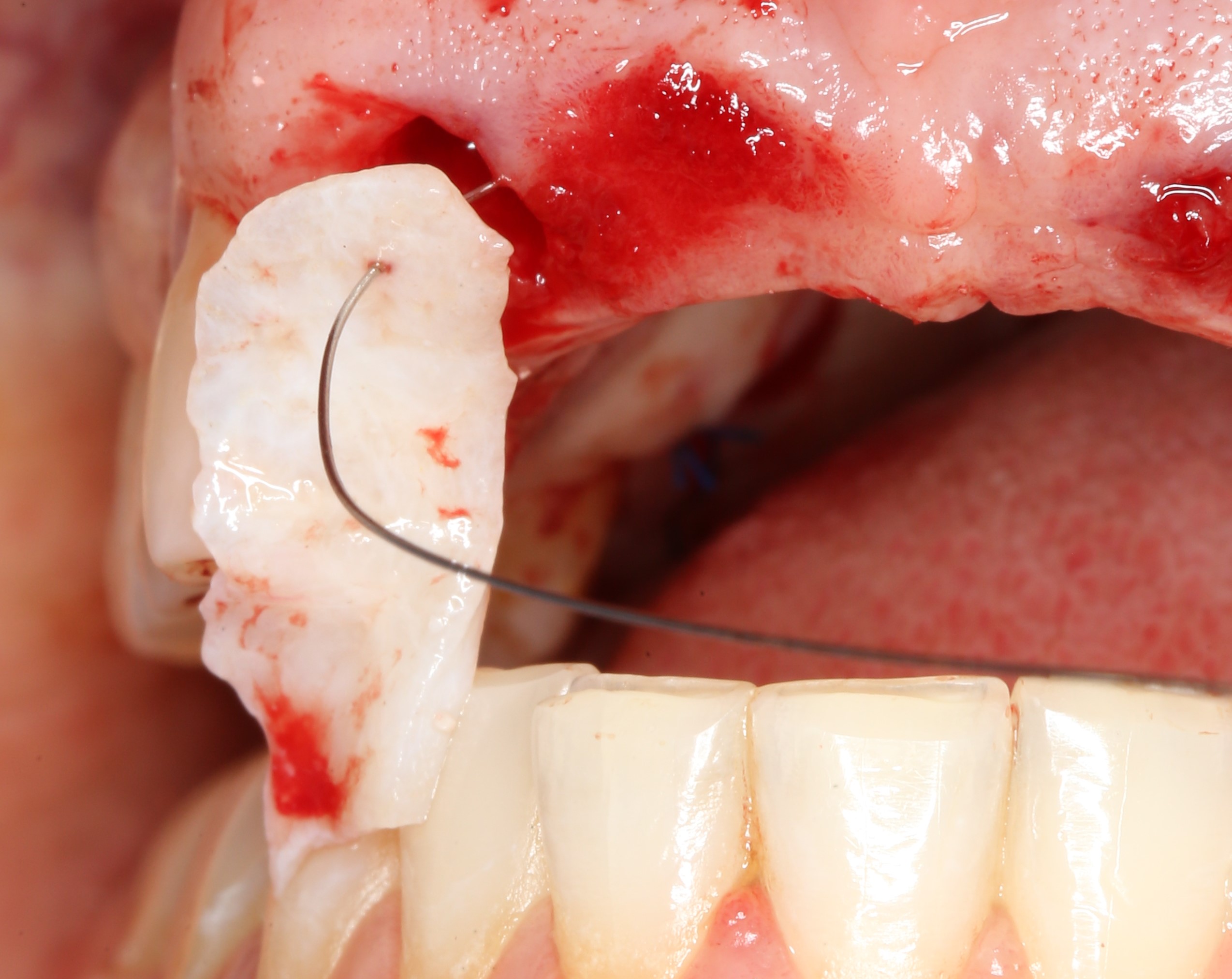 Мы не планируем как-то фиксировать пересаженный соединительнотканный лоскут — он отлично удерживается в тоннеле ригидностью тканей, потом еще прижмётся временным протезом. Проще говоря, мы обойдёмся без лишних швов.