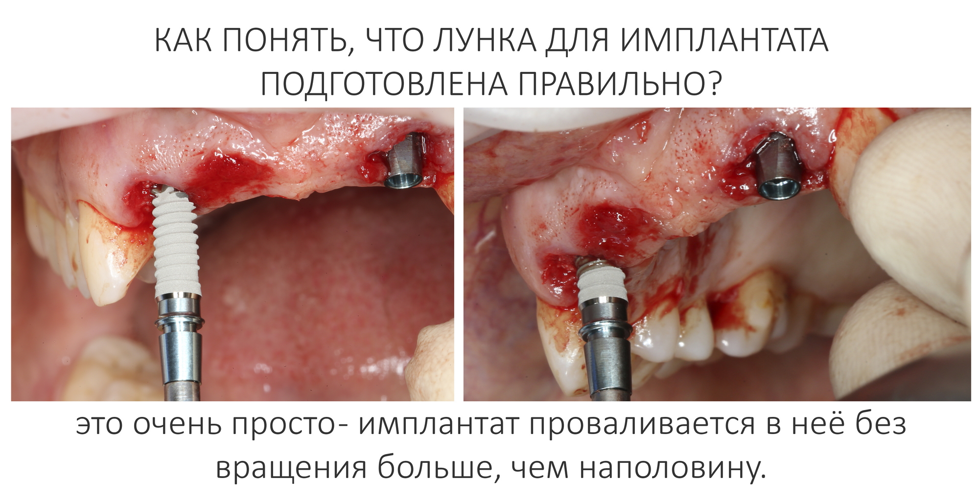 Важный момент — как понять, что лунка под имплантат подготовлена правильно? На самом деле, очень просто — в правильно подготовленную лунку имплантат проваливается без вращения больше, чем наполовину: