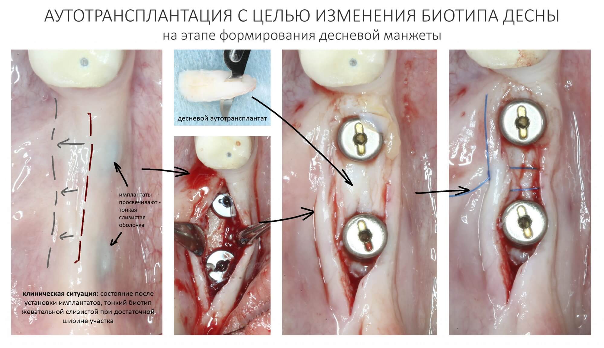 Первое является более-менее стандартным, относится к конструктиву имплантационной системы и является одним из факторов её выбора для решения клинических задач, что уже обсуждалось неоднократно. Второе — это индивидуальная особенность пациента и конкретной клинической ситуации, никак не зависящая от нас и выбранной нами тактики лечения. Для достижения наилучших и долгосрочных результатов имплантологического лечения, мы должны уделять внимание как первому, так и второму. Так формируется ключевая клиническая задача — изменение биотипа слизистой оболочки в ходе хирургического этапа стоматологической реабилитации.